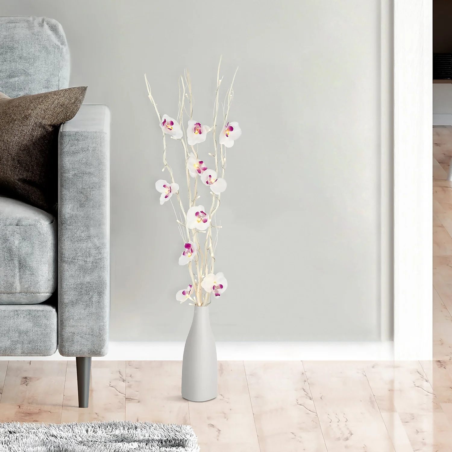 Small faux orchids and warm white fairy lights are wrapped around a clutch of 100cm rustic twigs to add a subtle glow to modern bedrooms and living spaces.